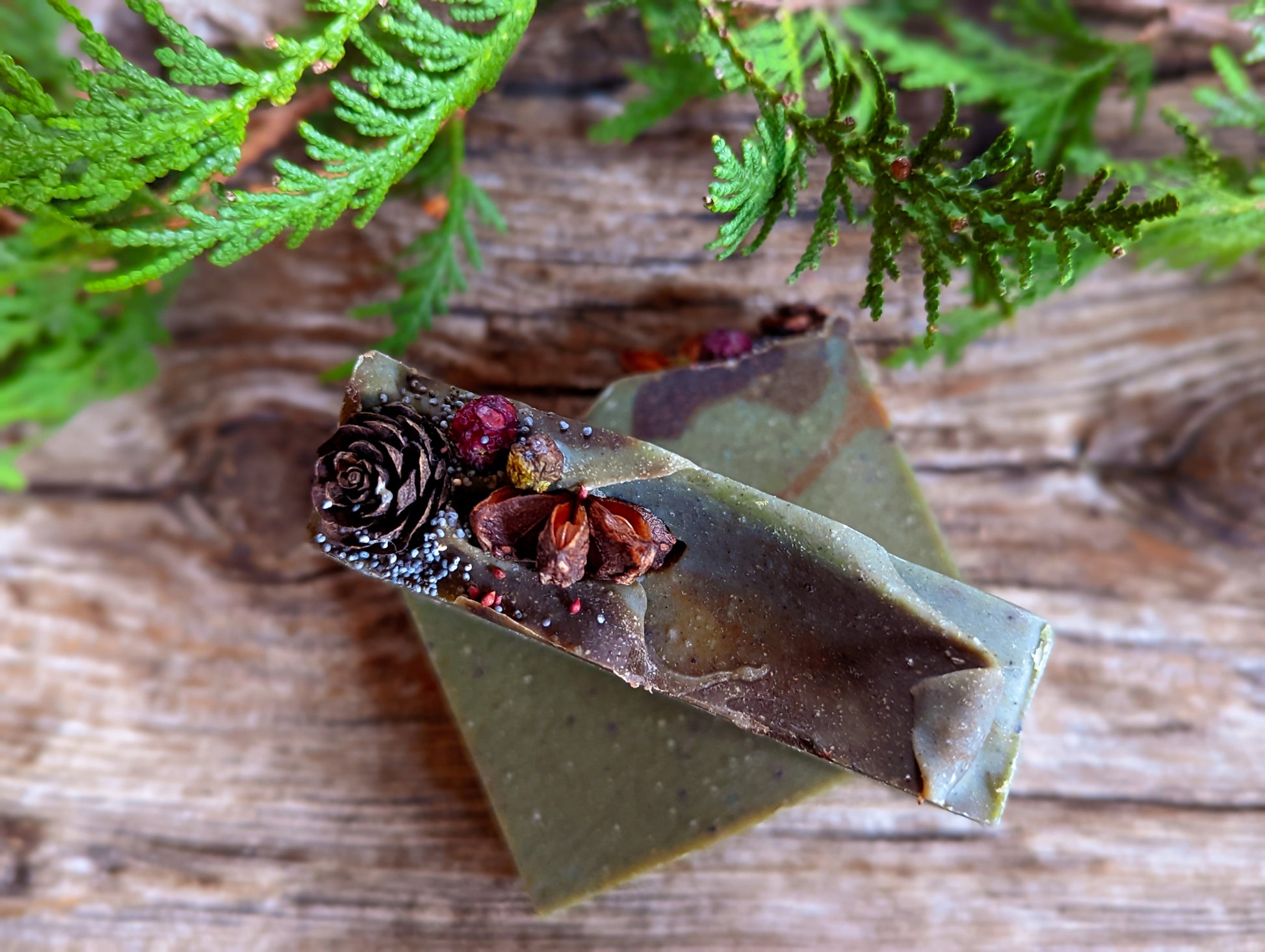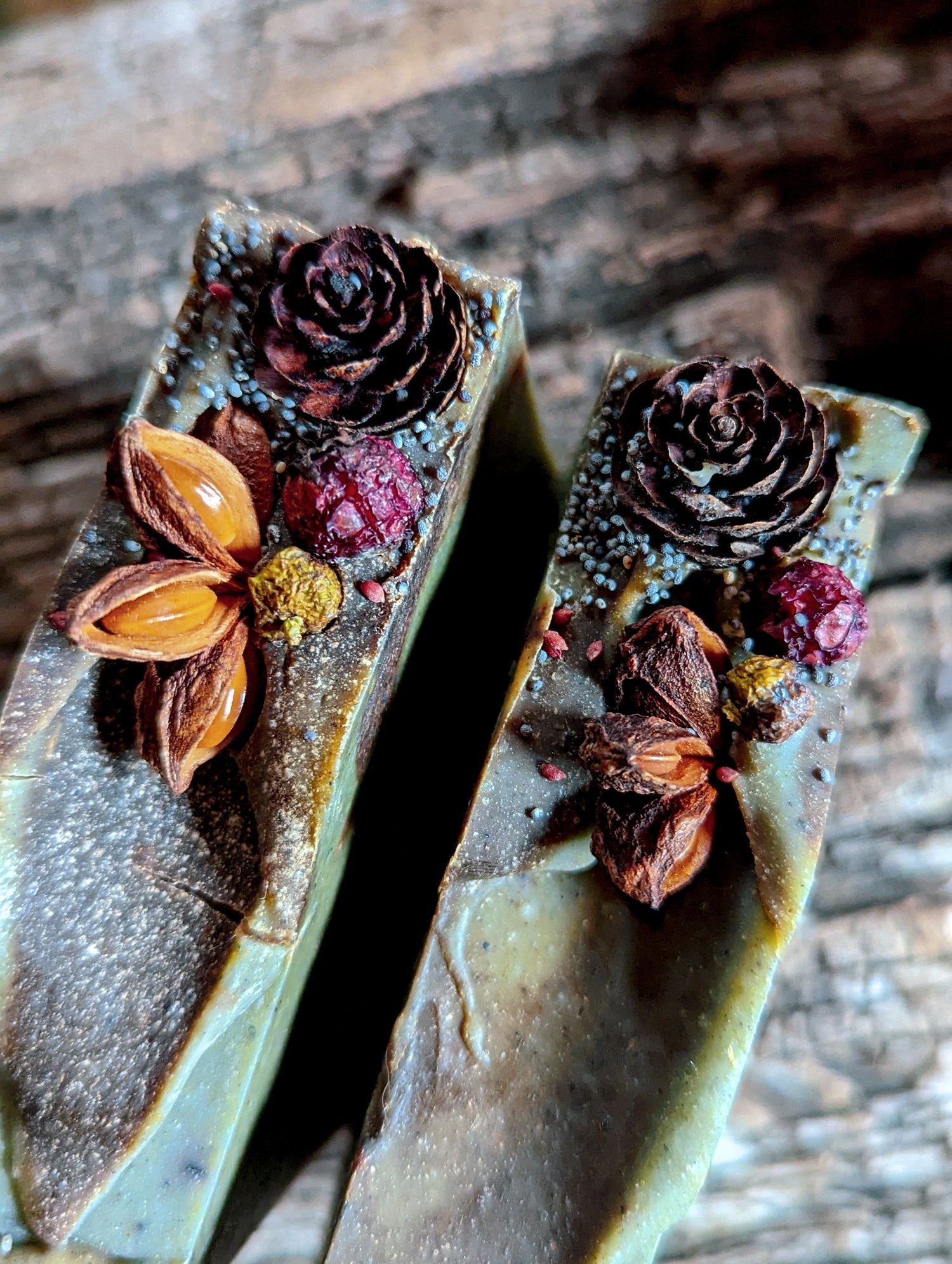 This bar is my ode to this ancient tradition. Crafted with raw fresh goat milk from our own Christmas goats and adorned with Juniper Berries, Hawthorn Berries, Pinecones, pink peppercorns, Star Anise, Cranberry Seeds, and Poppy Seeds. It is scented with an entire forest of fir needles, pine, cedar, and cypress with notes of cinnamon leaf, clove, star anise, lemon, rosemary and eucalyptus.